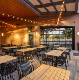 A 4,600 SF interior fit-out of a new restaurant in a multi-story building. The work included interior finishes, non-bearing demising walls, ceilings, lighting, and food service equipment. Exterior changes include a new patio railing and the addition of a new overhead door within an existing storefront opening.