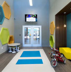 The Center is two-stories and 23,000 SF. The main level includes several classrooms for children from infancy up to four years of age, along with observation spaces, a central gathering/play area, family resources, offices, and a small commercial kitchen. The upper level features meeting and office spaces for the faculty. Each classroom features direct access to the exterior play areas. The exterior space features trails for riding trikes, different play areas composed of natural materials and vegetation of various sizes to encourage learning.