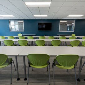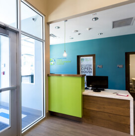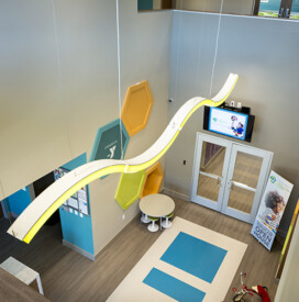 The Center is two-stories and 23,000 SF. The main level includes several classrooms for children from infancy up to four years of age, along with observation spaces, a central gathering/play area, family resources, offices, and a small commercial kitchen. The upper level features meeting and office spaces for the faculty. Each classroom features direct access to the exterior play areas. The exterior space features trails for riding trikes, different play areas composed of natural materials and vegetation of various sizes to encourage learning.