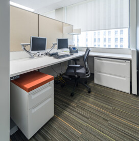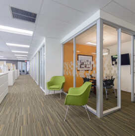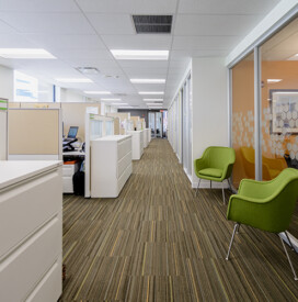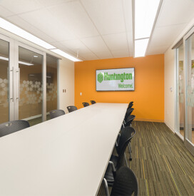 Our team renovated a 13,000 SF office space on the 7th-floor of a downtown office building. The 6th and 8th floors were occupied during the renovation, so the team performed the louder work off-hours and made all deliveries and trash removal before 7:00 am. Huntington Bank added a restroom renovation adjacent to the space mid-way through the project that extended the project another 4 weeks. With that addition, the project finished on schedule and $2,000 under budget.