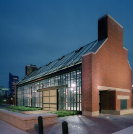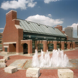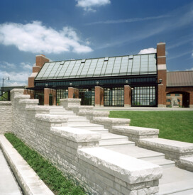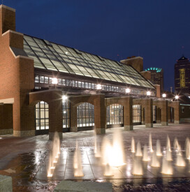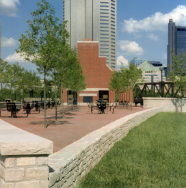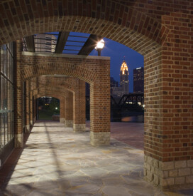 A 9-acre urban park featuring rights-of-way, floodwalls, and a 150-occupant pavilion complete with kitchen. The upper-level plaza includes an interactive fountain that encourages children to play. The park also has a large patio area with tables and chairs as well as amphitheater lawn seating facing the river, providing views of the river and downtown skyline.