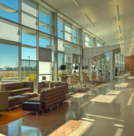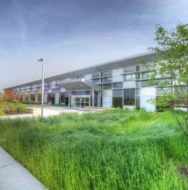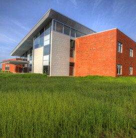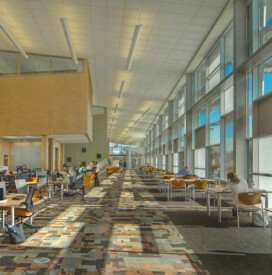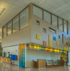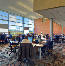 The new 86,00 SF academic center is the anchor of Columbus State’s new Delaware campus. The building’s teaching spaces include 20 classrooms, a distance learning classroom, computer lab, testing center, and two seminar rooms that can be opened to create one large lecture hall. The seminar spaces are separated from the main academic spaces and given their own entrance to allow for community use. An open learning commons area includes study tables, computer stations, casual seating for student use, and a cyber café.