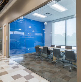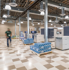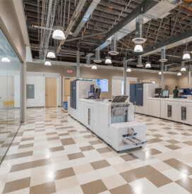 An existing 10,000 SF building was renovated into an in-house a print shop over 2 phases. The first phase replaced the existing single ply roof and insulation, the existing aluminum store front system, repaired and replaced the existing parking lot asphalt, installed a new covered “loading dock” platform, new site fence, landscaping, site lighting, and exterior coating on the exterior of the building. The second phase installed a new HVAC system, new data service to the building, new electrical wiring and lighting, new interior partitions, interior finishes and infilled the void below existing portion of slab on grade.